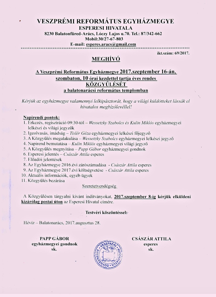 A Veszprémi Református Egyházmegye 2017. szeptember 16-án,