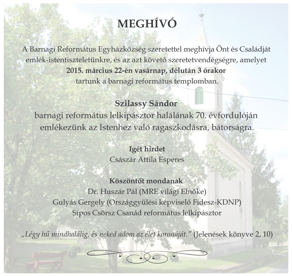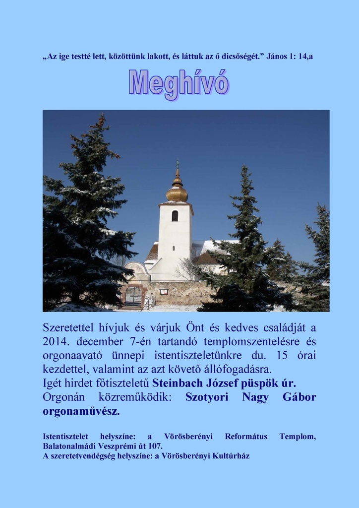 Szeretettel hívjuk és várjuk Önt és kedves családját a 2014. december 7-én tartandó templomszentelésre és orgonaavató ünnepi istentiszteletünkre du. 15 órai kezdettel, valamint az azt követő állófogadásra. Igét hirdet főtiszteletű Steinbach József püspök úr.