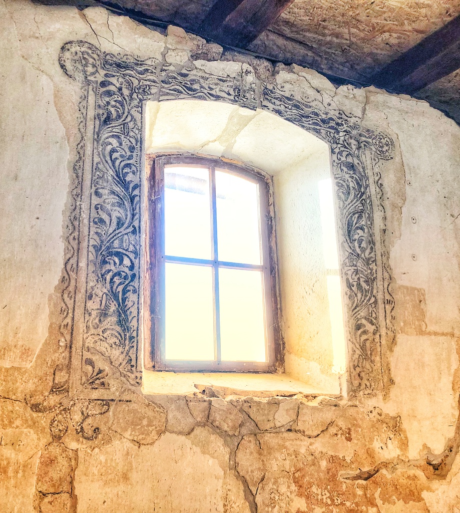 .... nos csoda történt. Nem tudok másként fogalmazni. Répássy Viktor festő-restaurátor az utolsó percben érkezve, az enyhe januári időjárásnak köszönhetően fel tudta tárni és konzerválni a Szentély déli falán levő díszítő ornamentikát (1.kép). A kutatás felszínre hozta a keleti falon levő ablak inda és szöveges díszítéseit, melyen a „báránya" szó tökéletesen olvasható.