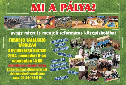 Szeretettel és tisztelettel meghívjuk Önt, és a gyülekezetek 6-7-8. osztályos hittanosait/konfirmandusait a 2014. évi Toborzó találkozóra a Tapolcai Református Egyházközség gyülekezeti házába.