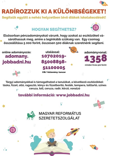 A Magyar Református Szeretetszolgálat idén is meghirdeti a „Radírozzuk ki a különbségeket!” - iskolakezdési kampányát.