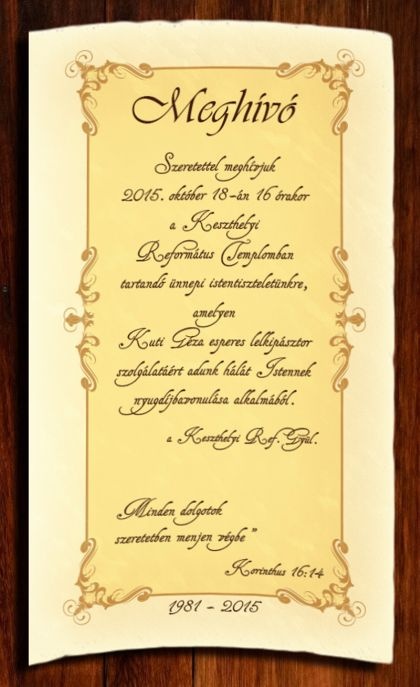 Szeretettel meghívjuk ünnepi hálaadó istentiszteletünkre Kuti Géza esperes lelkipásztor szolgálatáért (1981–2015) nyugdíjbavonulása alkalmából.