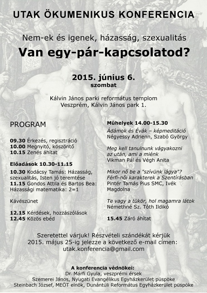 Szeretettel meghívjuk ökumenikus konferenciánkra 2015. június 6-án. Témánk: „Nem-ek és igenek, házasság, szexualitás". Előadóink segítségével párbeszédre, együtt gondolkodásra hívunk minden kedves érdeklődőt párkapcsolat, női és férfi szerepek témájában.
