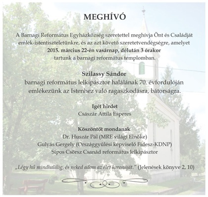 Szeretettel hívjuk és várjuk Önt és kedves családját a 2014. december 7-én tartandó templomszentelésre és orgonaavató ünnepi istentiszteletünkre du. 15 órai kezdettel, valamint az azt követő állófogadásra. Igét hirdet főtiszteletű Steinbach József püspök úr.